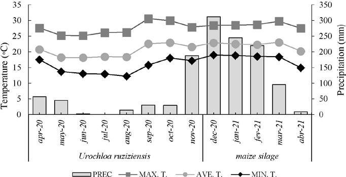 The weed community and phytosociological indices varied depending on the crop and season. The highest dry biomass of weeds was observed before cutting U. ruziziensis. Species richness and weed density were higher at the V4 growth stage of maize, prior to herbicide application.