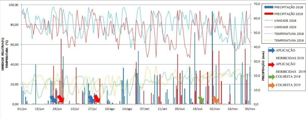 Foram instalados dois ensaios a campo, um (I) no ano agrícola de 2018 e outro (II) em 2019, em delineamento de blocos ao acaso, com 17 tratamentos e quatro repetições. Os híbridos de canola estudados foram a Hyola 571 CL e a Hyola 575 CL (Clearfield®). Nos dois experimentos testou-se os herbicidas: iodosulfuron, imazethapyr+imazapic, imazapic+imazapyr, imazethapyr, pyroxsulam, nicosulfuron, imazamox, diclosulam, imazaquin, chlorimuron – ethyl, sulfentrazone, sulfentrazone+diuron, pendimethalin, metsulfuron-methyl e flumioxazin, mais duas testemunhas, uma capinada e outra infestada. O azevém e nabo foram as plantas daninhas presentes na área experimental. Aos 7, 14, 21, 28 e 35 dias após aplicação dos tratamentos (DAT) foi avaliado o controle das plantas daninhas. Após a colheita determinou-se o peso de mil grãos e a produtividade.