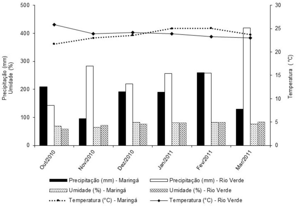 Os experimentos foram conduzidos em Rio Verde, Goiás e Maringá, Paraná. Os tratamentos foram constituídos pela aplicação dos herbicidas 2,4-D, atrazine, glufosinate e paraquat, acrescido da testemunha, aplicados na maturidade fisiológica das cultivares de soja BRS 7560®, M-Soy 6101®, NK 9070 RR®, BMX Potência RR®.